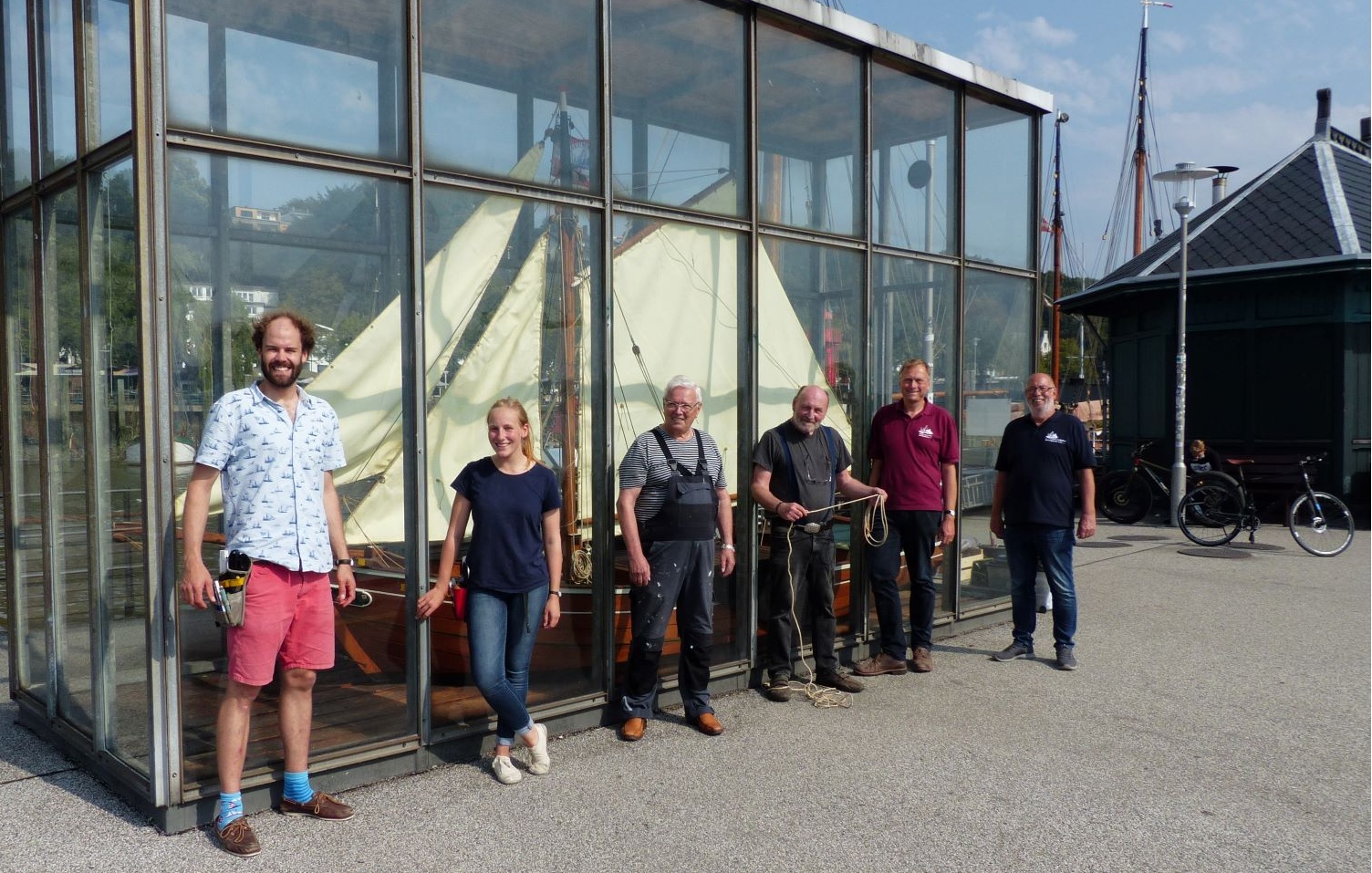 1 „Gemeinschaftsaktion im Museumshafen Oevelgönne“, von links nach rechts: Julius Raithel und Hannah Diefenbach (Clownsails Segelmacherei), Rainer Kugler und Peter Petersen (Takler im Museumshafen), Heino Schlichting (Vorsitzender MHOe), Bjørn Nicolaisen (Geschäftsführer MHOe)