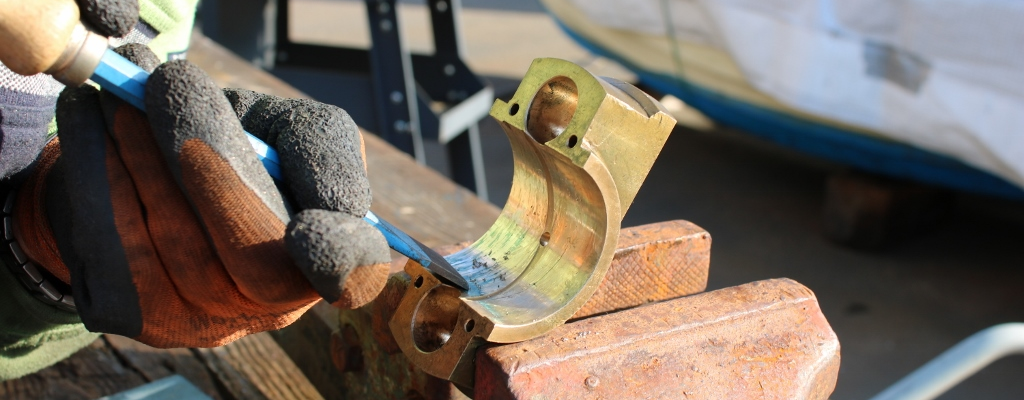 Am Wochenende setzte die Mannschaft von Otto Lauffer die routinemäßigen Wartungsarbeiten an der Maschine erfolgreich fort. Diesmal ging es um Lager und Kreuzkopf, die zum Niederdruckzylinder gehören. Bei strahlendem Sonnenschein konnte das Team einen Großteil der umfangreichen Handarbeiten auf dem Ponton in Neumühlen durchführen. Maschinist Christoph erklärt dazu: „Alle Lager – beide Seiten des Kreuzkopfes und die Pleuel wackelten und mussten etwas enger gestellt werden. Dazu haben wir Bleche entfernt bzw. durch dünnere ersetzt. Es zeigte sich, dass die Pleuellager konkav eingelaufen und ebenso die Kreuzkopflager schief waren. Wir haben alle Lager tuschiert und geschabt.“