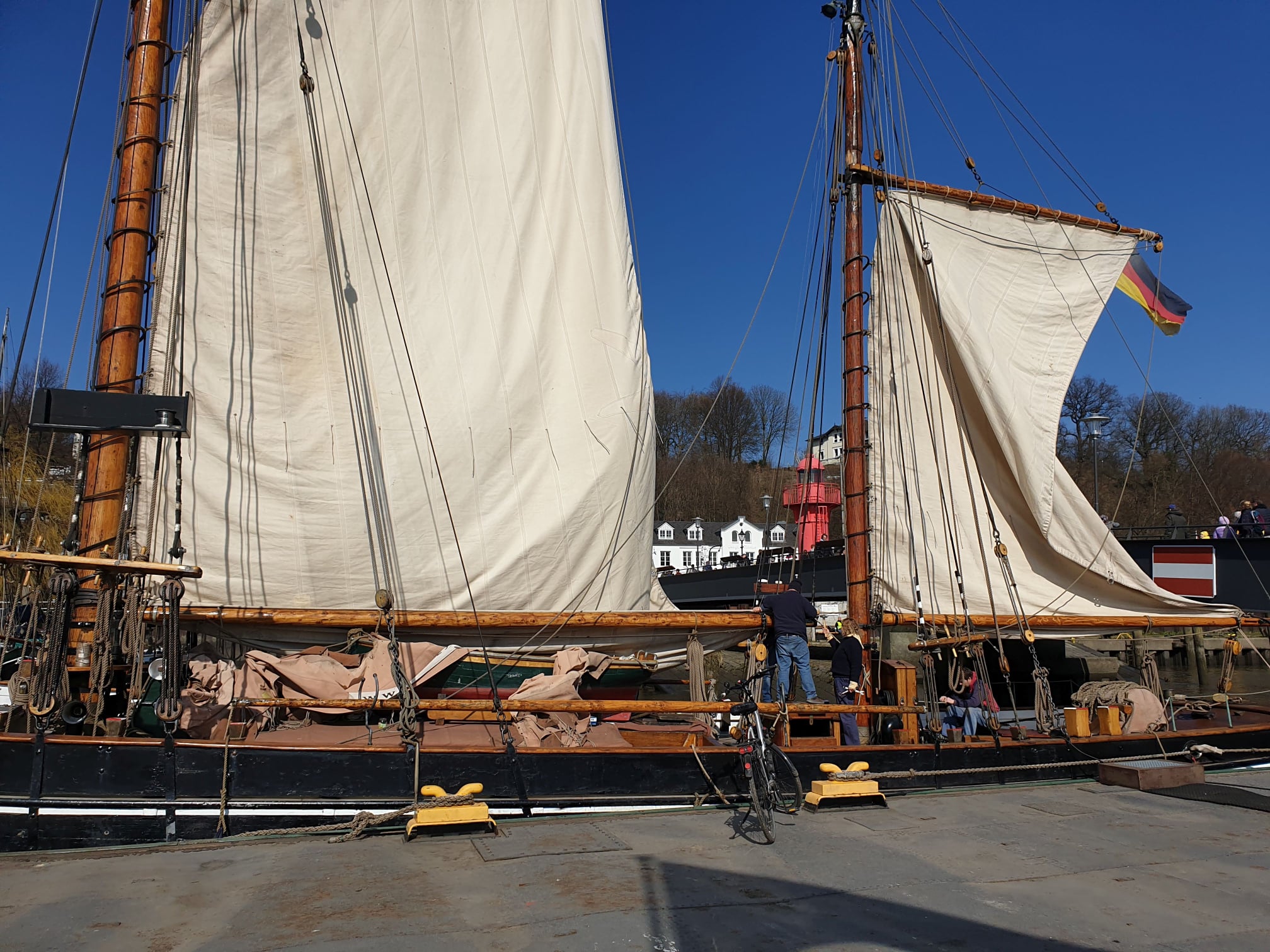 Das Wetter hat sich in der Zwischenzeit komplett geändert. Die Sonne bringt angenehme zweistellige Temperaturen. Mütze Schal und Handschuhe sind längst im Fahrradkorb verschwunden, ebenso die Jacke und es ist Frühlingsstimmung in der Luft. Auch auf anderen Schiffen im Museumshafen wird eifrig gearbeitet. „Anna“ stellt ihren Mast. „Moewe“ kehrt nach ihrem Arbeitstag in den Hafen zurück. Überall sind Leute zu sehen und es wächst wieder das Gefühl Teil eines Vereins zu sein, mit vielen an einem Strang zu ziehen.